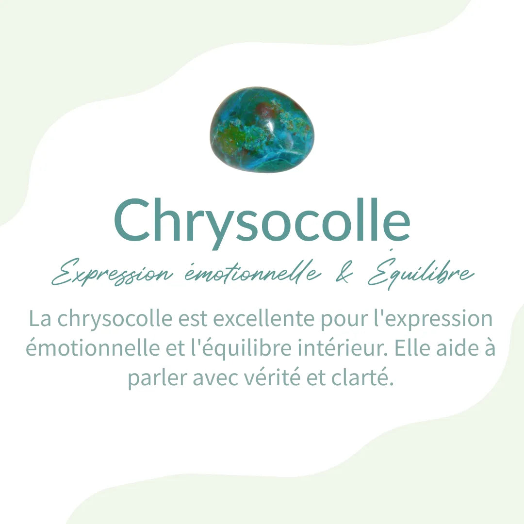 Chrysocolla is the stone of calming, peace, and patience. It dispels guilt, anxieties, and conflicts that one may feel within oneself or with those around them. Thanks to it, emotions are regulated and mood disorders are channeled.