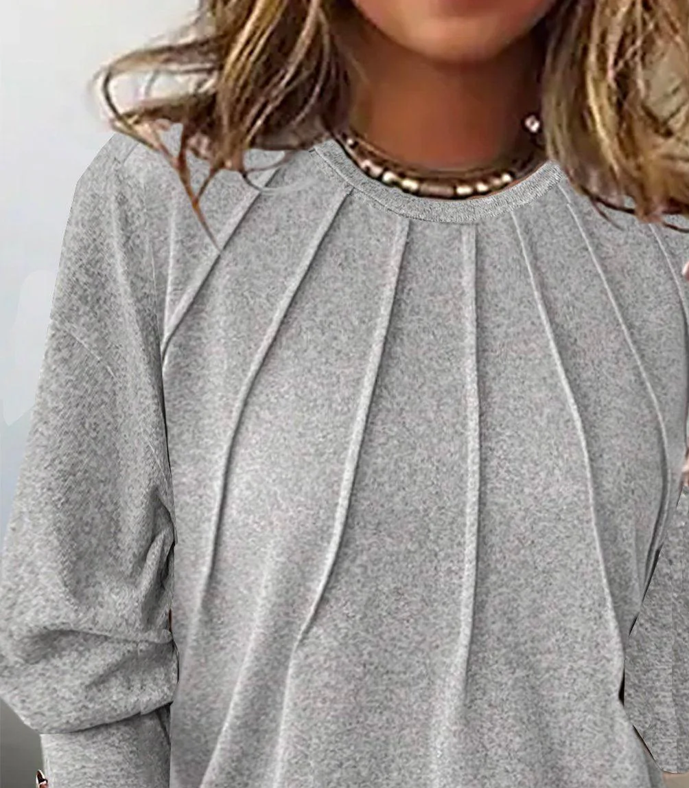 This striking gray top with a round neckline and long sleeves is a versatile addition to any wardrobe. Made from high-quality material, it offers comfort and style for any occasion. Perfect for layering or wearing on its own, this top will quickly become a favorite.